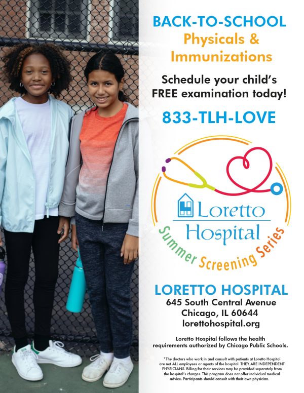 Loretto Hospital is offering free back-to-school immunizations and physicals for uninsured and underinsured families living in Austin now through the end of September. Same-day and walk-in appointments are available. For additional information, call 833-TLH-LOVE.